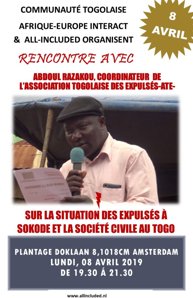 Lundi 8 Avril 19.30h à Dokzaal, Plantage Doklaan 8, 1018 CM Amsterdam – organisation: Afrique-Europe Interact, All Included et la Communauté Togolaise –